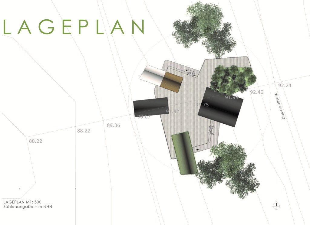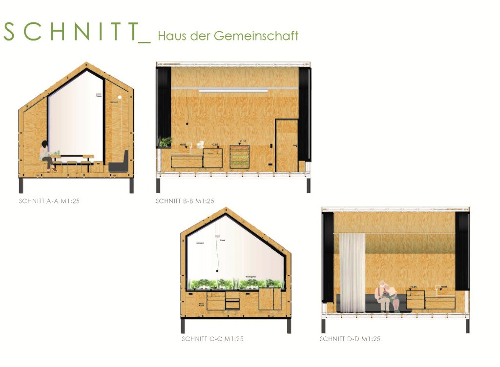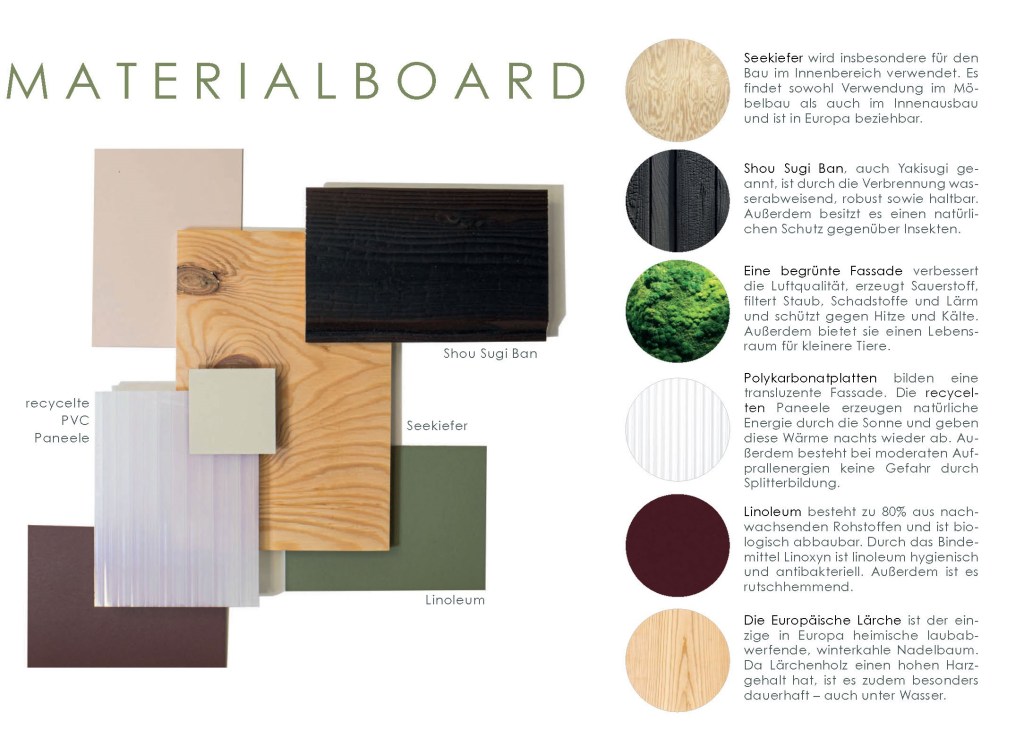 begrünte und eine dunkle, hölzerne Fassade. Die verschiedenen